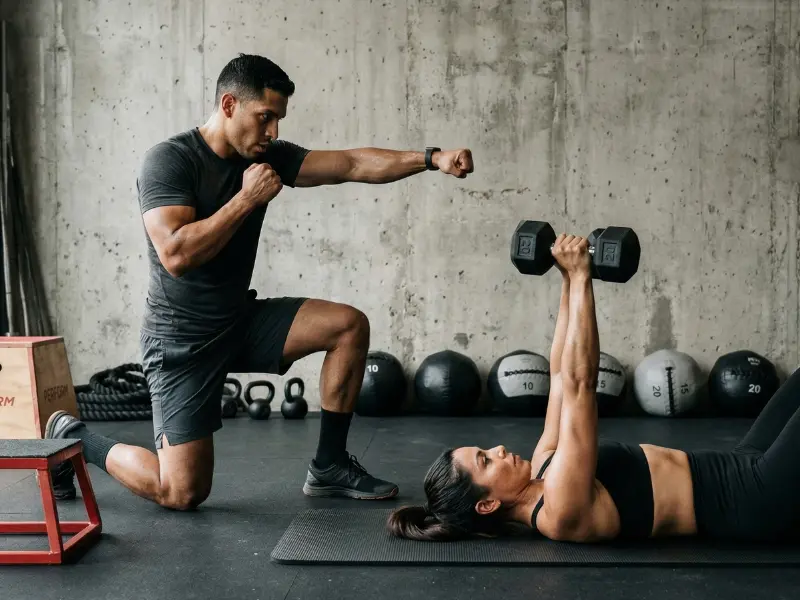 Instructor en tiempo real corrigiendo tu técnica y motivándote en cada rep.